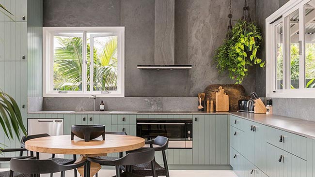 Trong căn bếp này, cảm xúc yên bình và tinh tế được thể hiện trong màu xám lạnh của tường, các vật dụng gỗ màu xanh dương nhạt và kệ tủ bếp dưới với sự yên tĩnh trong sắc màu nâu mật nồng , màu của năm 2021. Các sắc màu này khi kết hợp cùng đồ gỗ sáng màu, kim loại bạc và các vật dụng thủ công mang lại chiều sâu, sự yên bình và thoáng đãng cho không gian.
