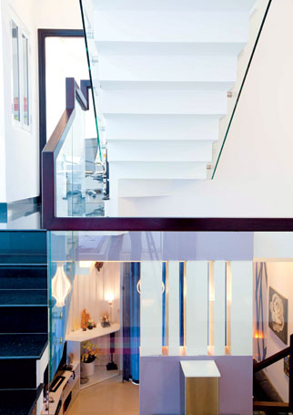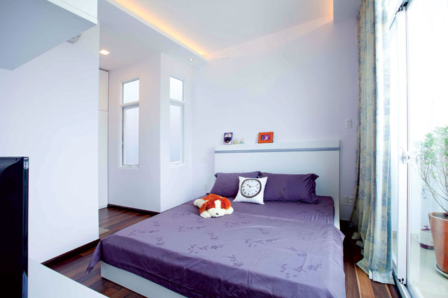 Nhà trong hẻm nhỏ (vừa chui lọt một xe gắn máy) nhưng với lợi thế hai mặt tiền, ta có thể dễ dàng trang trí, lấy sáng, lấy gió… Giải pháp kiến trúc dùng cho mặt tiền là một khối trụ hình thang được khoét vài chỗ thích hợp để làm bancông, kết hợp những mảng kính tạo điểm nhấn và hiện đại cho công trình.