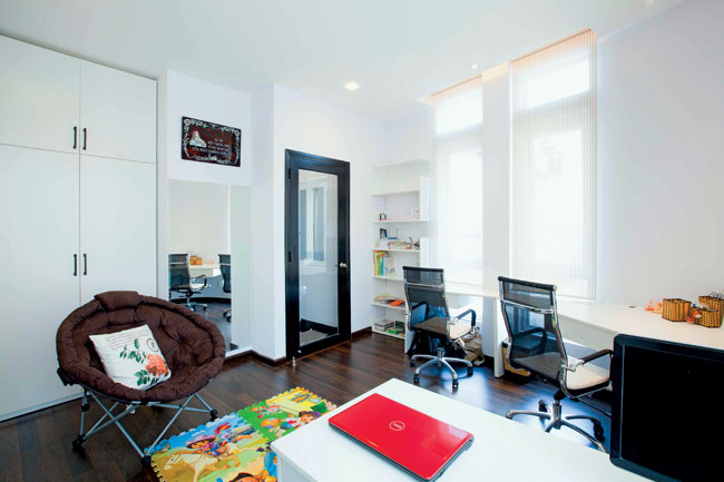 Phòng ngủ, phòng làm việc được phân chia vừa đủ nhu cầu. Nhưng vẫn giữ cách bố trí nhẹ nhàng, thanh thoát và lấy cảm hứng trang trí từ màu sắc thiên nhiên.